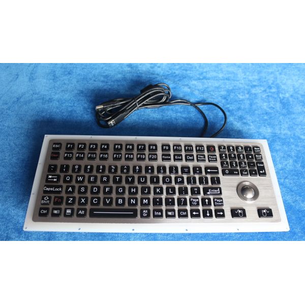 Description: 116 keys compact format IP65 dynamic water proof & vandal proof stainless steel industrial keyboard with individual durable and robust polymer keys with full keyboard functionalities, totally sealed and ruggedized industrial PCB with carbon-on-gold key switch technology with stroke (1.20±0.10mm) with extremely good tactile feeling for fast and accurate data input without any noise, function keys F1, F2, ...F19, F20 are on the top line for easy operation, individual numeric keypad integrated, with integrated IP68 dynamic waterproof 25mm optical trackball module with +800 DPI for fast and accurate cursor position, FN + Clean combination key lock/disable the keyboard for easy cleaning and washing without taking out the keyboard from PC, one complete silicone rubber alone the rear stainless steel plate for easy mounting & sealing tightly with cabinet. Stainless steel back plate with holes for rear mounting solution, which is good for outdoor application with direct rain and very harsh environments with humidity, much dynamic water, oil, dirt, salt mist etc. Adjustable backlight included (RED, BLUE or WHITE etc.)